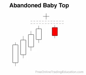 An Abandoned Baby Top is a rare bearish three bar reversal pattern that develops after an up leg. This pattern begins with an up gap followed by a doji or similar smaller candlestick. A down gap then occurs on the next bar leaving the doji "abandoned" at the high.