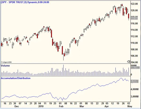 Some of the best Accumulation/Distribution signals occur when the price and volume of the chart being analyzed has also set up a bullish or bearish pattern. Using the Accumulation/Distribution for additional confirmation of what has already been "read" in the chart can be a powerful addition to the assessment tools used by a technical analyst.