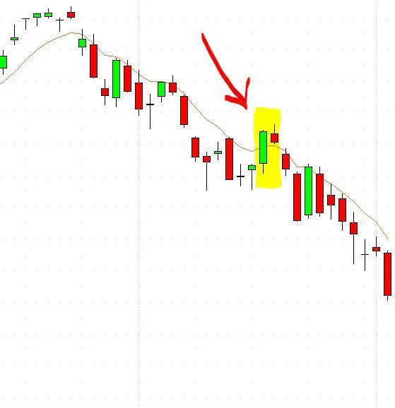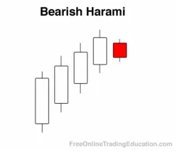 A Bearish Harami is a two bar bearish candlestick pattern where each candlestick has the opposite color. After a run-up in price, this pattern is formed when the real body of the second candlestick trades completely within the range of the real body of the previous candlestick.