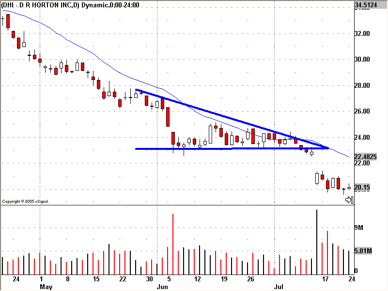 The pattern starts to form when price action traces an orderly price rise from a swing low much like a pullback sell. The price then declines down to the prior swing low and stalls. A second rally occurs as underling support is decreased and the stock then forms a lower swing high. This occurs over and over again until a series of equal swing lows and lower swing highs are formed.