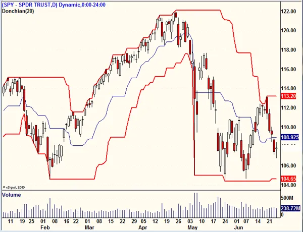 The Donchian Channel entry and exit signals are typically the most meaningful when the price and volume of the chart being analyzed have also set up a bullish or bearish pattern. Using the Donchian Channel for additional confirmation of what has already been "read" in the chart can be a powerful addition to the assessment tools used by a technical analyst.