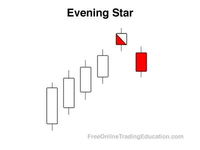 An Evening Star is a three candlestick bearish candlestick pattern that occurs after an up leg and starts out with an up bar with a large real body. The second candle has a narrow range and gaps up on the open. The last bar opens with a gap down and then closes as a bearish candlestick below the midpoint of the body of the first bar.