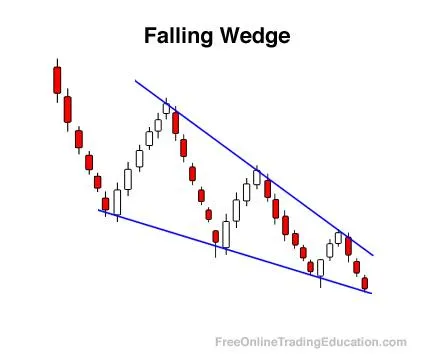 A Falling Wedge is a chart pattern within the context of a downtrend composed of two downward sloping and converging trendlines connecting a series of lower swing/pivot highs and lower swing/pivot lows.