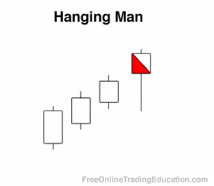 A Hanging Man is a bearish candlestick pattern that develops after an up leg and has the exact appearance of a hammer. This candlestick opens bullish but sells off dramatically. After the sell off, the price rallies and closes near the high of the bar and well off the lows. This candlestick has an open and close near each other with a long lower shadow.