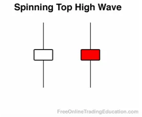 A Spinning Top Wave, also called a High Wave candle, is candlestick that has an open and close price near each other which produces a small real body and color is of no importance. They also have long upper and lower shadows that significantly exceed the length of the body. These types of candlesticks indicate indecision and subsequent consolidation.
