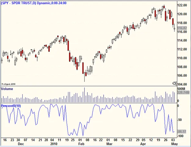 Traders typically use this oscillator by watching for extreme line crossovers. For example, in an up swing, prices tend to close near the highs and in a down swing prices tend to close near the lows. Reversal signals occur when the %K line crosses the "%D" line.