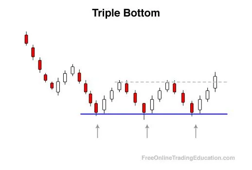 Triple Bottoms can be a stronger bullish reversal pattern after further confirmation when the next swing/pivot low that is produced is even higher.