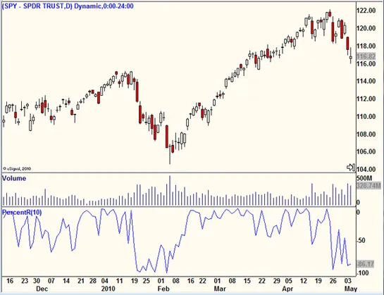 When using Percent "R" in technical analysis, both the entry and exit signals are assessed by most analysts in context with both price and volume of the chart being analyzed.