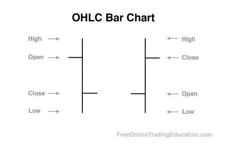 Bar Charts are often referred to as 'Western Bar' or 'OHLC' charts. This acronym stands for Open, High, Low and Close chart. Data is plotted on the chart for the open, high, low and close of each period represented by the time frame. The top of the bar is the high, the bottom the low, left side hash mark is the open and the right side hash mark is the close.